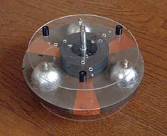 物理寸法 チタン酸バリウムディスク直径 150φmm 球型コンデンサー 37.5φmm×3 球型コンデンサー配置 120° 中心より球型コンデンサー中央までの距離 52mm 9/10/2023変更 54mm 10/31/2021変更 球型コンデンサー間距離 90mm 球型コンデンサー中央間の円周長 326.48mm 球型コンデンサー中央間の電気的円周長 214mm 球型コンデンサーの単独静電容量 2.36pF 球型コンデンサー間の静電容量 75pF 物理特性 臨界周波数 40.27MHz 鉛直磁場 100G 〜 主な部材 チタン酸バリウムディスク BaTiO3 150φmm×10mm特注品。1010g (4.33mol) 比誘電率1210 フェライトブロック FT240-#77材 外寸62mmφ×内寸36φmm×13t×3 315g 鉛直磁場 異方性フェライト リング型マグネット外寸60mmφ×内寸40φmm×7mm×4枚 異方性フェライト 角形マグネット47×22×14mm適宜追加 球型コンデンサー アルミニウムに白金貼り 37.5φmm 1.5t 表面積441.8? 駆動用電極 銅箔 1/16 面積1103.mm 現在なし ボディー 18-8ステンレス オーバースカート アルミニウム 現在なし パワーコイル 検討中 屋根 磁性ステンレス現在なし 虚磁荷ケーブル 検討中 磁気柱 78パーマロイ 70mm×径7.2φmm現在なし 円盤機関を製作してみると宇宙の創造主(神)に出会う。